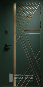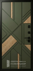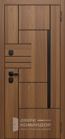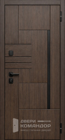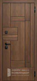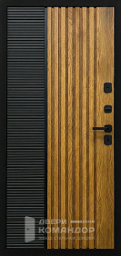 Это металлическая входная дверь, которая работает как дизайнерский акцент: тёмная отделка под дерево делает вход визуально тёплым, но без лишних украшений. Получается строгий образ, когда всё выглядит собрано.