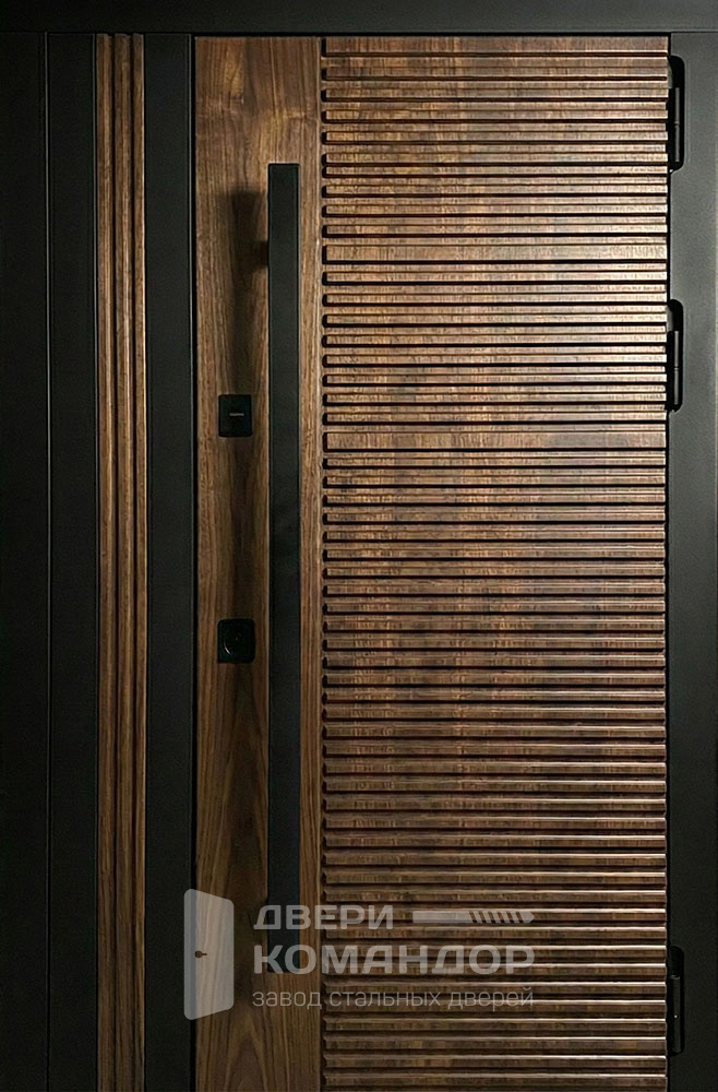 Рельеф в виде частых горизонтальных линий добавляет глубину и делает дверь заметной, но не кричащей. Свет ложится по-разному, поэтому фасад не выглядит плоским даже в тёмном цвете.