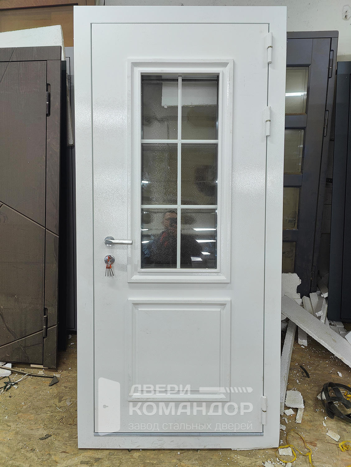 Входная дверь в квартиру с зеркалом белая внутри размером 96x205 см. на заказ с доставкой и установкой по цене 43050руб. Возможно изготовить по индивидуальным размерам. Также возможно боковые вставки и фрамуги в стиле и цвете двери. Изменение цвета отделки и фурнитуры не влияет на стоимость.