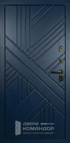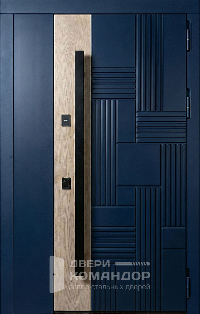 Эта дверь продаёт не квадратные метры металла, а впечатление: глубокий матовый синий задаёт спокойный фон, а вертикальная вставка под светлое дерево вытягивает композицию вверх. В итоге вход выглядит собранно и дороже, даже если вокруг обычная отделка.