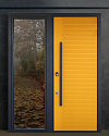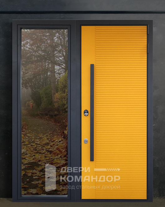 Для широких порталов подходит входная дверь с боковой фрамугой — одинарной или парной. Боковые вставки работают как саидлайты: добавляют света и визуально расширяют вход. В частных домах их часто совмещают с верхней фрамугой, получая полноценную входную группу.
