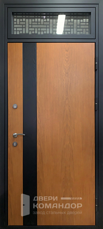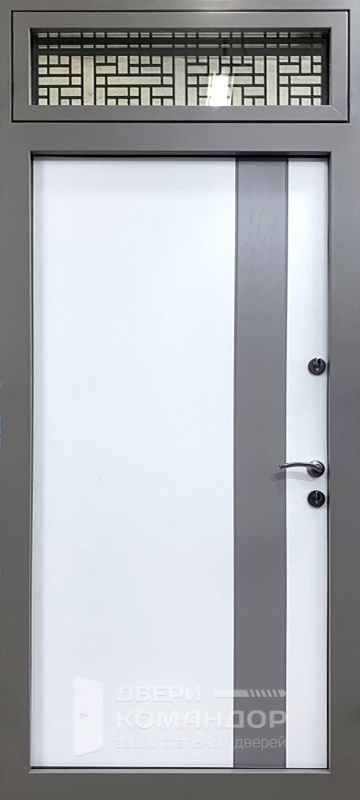Фрамуга здесь не декоративная «для галочки». Рисунок в стекле — строгая геометрия, которая подчёркивает стиль двери и поддерживает тему вертикалей на полотне. За счёт этого входная группа воспринимается цельно: сверху — графичный акцент, ниже — лаконичные плоскости и контрастные вставки.