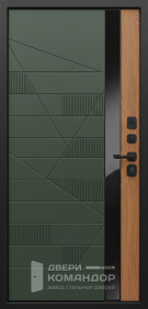 Тёмная рама и глубокий коричневый тон по периметру делают дверь собранной и солидной. Центральная панель под дерево добавляет тепла, чтобы входная зона не выглядела слишком сурово.