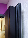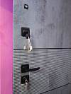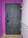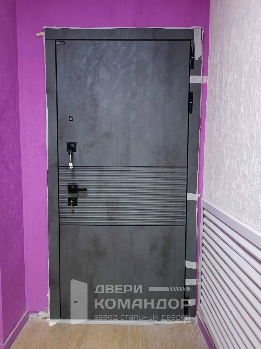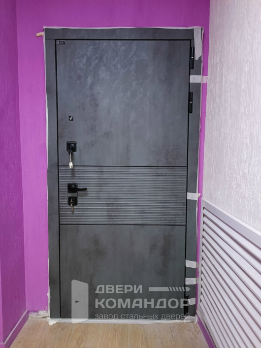 У этой двери характер в стиле «строгий урбан»: снаружи — тёмный каменный эффект «чёрный кварц» на МДФ с поперечной фактурной вставкой, которая меньше боится царапин и не требует капризного ухода. Внутри — зеркало во всю высоту с лёгкой тонировкой «Лабиринт»: прихожая сразу кажется просторнее, а зеркальная полоса дисциплинирует свет и скрывает случайные отпечатки. Конструкция рассчитана для квартиры: жёсткая коробка, несколько контуров уплотнения и плотная посадка гасят шум из подъезда и не пускают запахи. Чёрная фурнитура смотрится единообразно и ухватисто, есть глазок и удобная ночная защёлка. Практичное решение для тех, кто хочет лаконичный дизайн и порядок на входе каждый день.