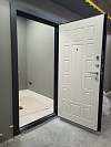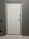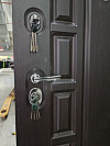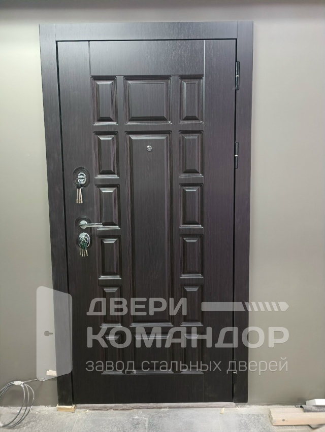 Эта дверь создана для квартиры, где важны тишина и аккуратный порядок. Снаружи — тёмная МДФ-панель с классической кассетной фрезеровкой: благородная текстура древесины смотрится солидно и не подчёркивает следы касаний. Внутри — светлая панель с тем же рельефом: прихожая кажется просторнее, а гладкое покрытие легко протирать. В конструкции двери Консул New Дверей Регионов — два разнесённых замка и плотный притвор; уплотнители глушат шумы с площадки, полотно закрывается мягко и герметично. На кромке виден мощный запорный узел с несколькими ригелями, изнутри — удобная поворотная задвижка для быстрого запирания без ключа. Хромированная фурнитура с уверенным ходом дополняет строгий внешний вид, а МДФ устойчив к мелким царапинам и ежедневной уборке — практично с обеих сторон.