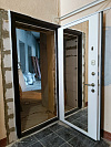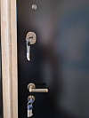 Дверь для городской квартиры, где важны порядок у порога и удобство внутри. Снаружи — металл с порошковым покрытием в глубокий тёмный тон: шагрень скрывает следы эксплуатации, не капризничает к влажной уборке подъезда и аккуратно выглядит годами. Внутри — МДФ с большим зеркалом из ПВХ: оно визуально расширяет прихожую, не бьётся как стекло и не боится перепадов влажности. Контур уплотнения даёт плотную посадку без сквозняков и запахов с площадки, глазок обеспечивает контроль, «ночная» задвижка позволяет запереться изнутри без ключа. Декоративная фурнитура под бронзу с фактурной ручкой добавляет характер, а двухцветная окраска металла подчёркивает идею: строгий фасад снаружи, свет и порядок внутри.