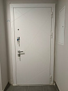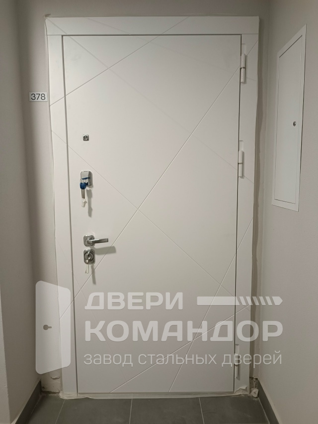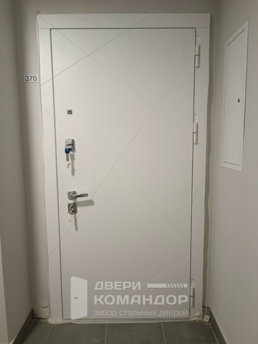 Белая входная дверь с лаконичным характером для квартиры: снаружи гладкая МДФ-панель с диагональной фрезеровкой делает полотно визуально легче и аккуратнее, не собирает пыль и легко отмывается после ремонта. Внутри — зеркало почти во весь рост: узкий коридор становится светлее и просторнее, удобно взглянуть на себя перед выходом. Многоконтурный уплотнитель по периметру гасит запахи и шум подъезда, плотный притвор не оставляет щелей. Хромированная фурнитура смотрится свежо на белом фоне и служит долго, не тускнеет. Глазок даёт хороший обзор площадки. Решение для тех, кто любит чистую геометрию и практичность: холодный блеск металла, спокойная белая гамма и зеркало, которое заменяет отдельную консоль в прихожей.