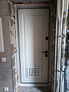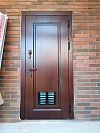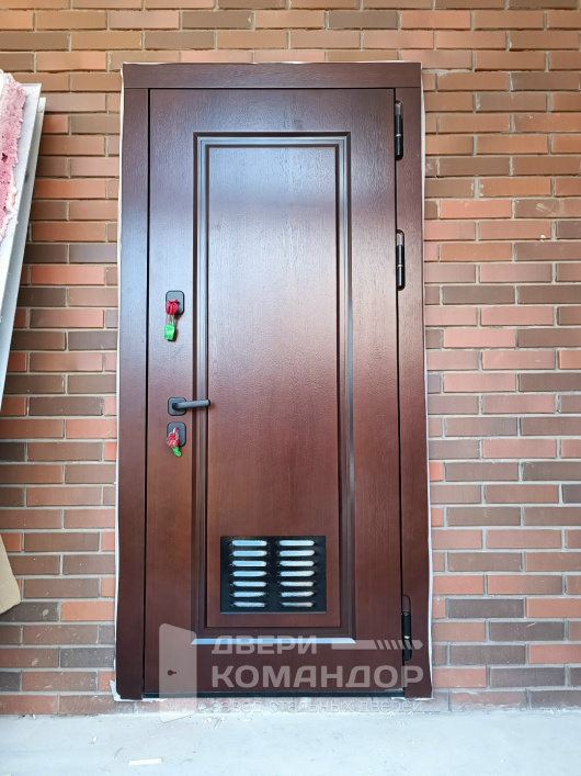 Практичное решение для частного дома — вход в котельную или техпомещение. Снаружи — тёплый оттенок под шпон с аккуратными фрезами: фактура благородно играет на солнце, мелкие касания и следы эксплуатации незаметны. Внизу интегрирована вентиляционная решётка: обеспечивает приток воздуха для работы оборудования и снижает риск запахов в доме. Внутри — спокойная эмаль светлого тона, визуально расширяющая узкий проход и легко моющаяся. Плотный притвор, несколько контуров уплотнения и противосъёмные штыри на петлевой стороне добавляют тишины и защищённости, а цилиндровые ригели запирают дверь уверенно. Лаконичная чёрная фурнитура собирает образ и не спорит с отделкой стен.
