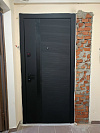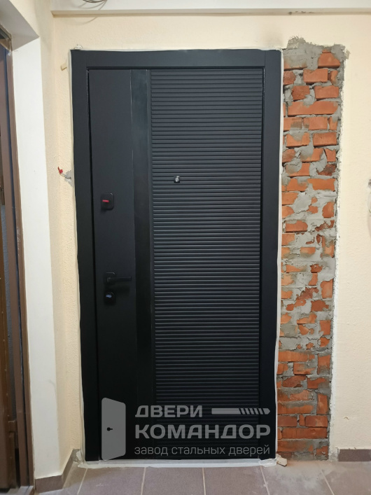 Дверь для квартиры и подъезда, где важны тишина в прихожей и аккуратный вид со стороны лестничной клетки. Снаружи — глубокий графит с рельефной горизонтальной 3D-фрезеровкой: скрывает следы касаний и смотрится солидно. Внутри — светлая МДФ-панель с классическими картушами, визуально расширяет коридор и легко протирается. По фото видно два разносистемных замка, глазок и плотная посадка полотна — закрывается мягко, без щелей и звона. У стардис комфорта приятно продуман контраст: чёрная внешняя фурнитура и тёплая бронза внутри, а по торцу — фирменное тиснение бренда. Материалы рассчитаны на ежедневную эксплуатацию: не выгорают, устойчивы к мелким царапинам и бытововой химии.
