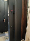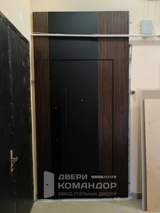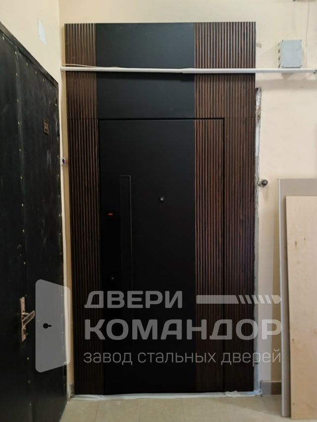 Эта модель создана для квартиры и входа в подъезд, где важны тишина, прочность и стиль. Снаружи — строгая матовая панель с интегрированной вертикальной ручкой-штангой почти на всю высоту: за неё удобно тянуть даже со свёртками в руках. Сверху — аккуратная фальшфрамуга, визуально поднимающая проём; по бокам — рельефные ламели, задающие графичную архитектуру узла. Внутри — МДФ с тонкими продольными каннелюрами в тёплом древесном оттенке: поверхность стойко переносит касания, не боится мелких царапин, легко протирается и не выгорает в условиях подъезда. Два разнесённых замковых узла с мощными ригелями, «ночная» защёлка и глазок отвечают за спокойствие, а аккуратное тиснение бренда на торце подчёркивает уровень исполнения. Честная, спокойная дверь, которая делает вход в дом продуманным и заметно солиднее.