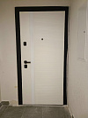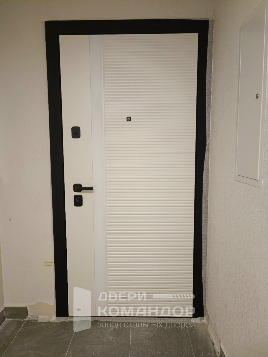 Stardis Expert с расширением проёма — аккуратная квартирная дверь, которая сразу собирает вход в единую раму: широкий портал в тёмном тоне делает проём визуально ровным и «завершённым». Снаружи — белая МДФ-панель с горизонтальным рифлением: свет красиво ложится на мелкие волны, а фактура скрывает случайные следы от ключей и сумок. Внутри — гладкая белая поверхность из той же МДФ для спокойной, светлой прихожей. Износостойкое покрытие рассчитано на ежедневные касания и влажную уборку, не желтеет под светом подъезда. Фурнитура — лаконичный матовый чёрный, тактильно тёплый и не маркий. Две независимые группы запирания работают мягко; ригели выходят мощно и без заеданий. По периметру — уплотнение для плотного, бесшумного закрывания, а аккуратный квадратный кожух глазка завершает строгую геометрию полотна.