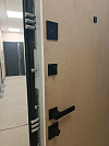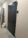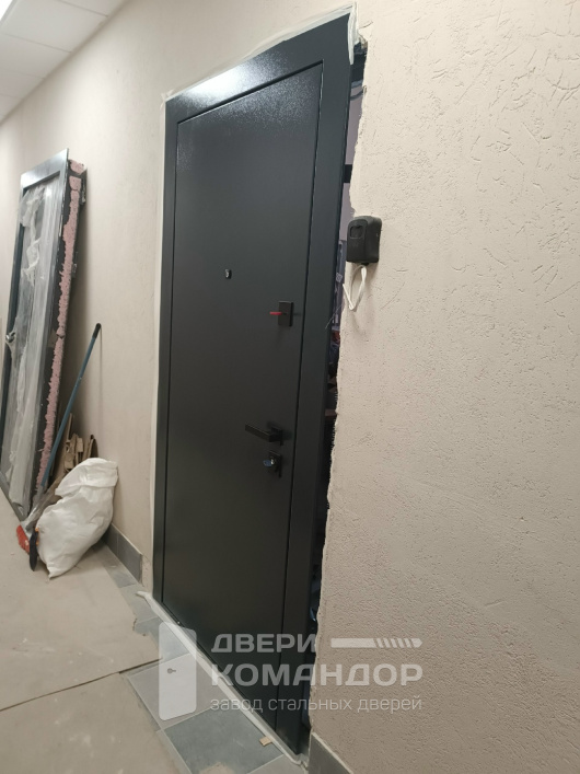 Эта дверь — для квартиры и спокойной жизни в подъезде. Снаружи прочное порошковое покрытие глубокого графита с мелкой фактурой: не боится частых касаний, стойко держит цвет и маскирует мелкие следы эксплуатации. Внутри установлена временная МДФ-панель без декора — её удобно не жалеть во время ремонта, а затем заменить на финишную отделку под интерьер. Монолитное полотно и усиленный притвор с плотным контуром уплотнения дают тихое мягкое закрывание, а массивные ригели на торце внушают уверенность. Лаконичная квадратная фурнитура поддерживает строгий образ и не спорит с будущей отделкой прихожей.