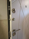 Строгая белая входная дверь для квартиры с аккуратной геометрической фрезеровкой сразу освежает прихожую и не спорит с интерьером. С обеих сторон — МДФ-панели: они тихие, тёплые на ощупь и легко оттираются от бытовых следов, не выгорают и достойно держат царапины в ежедневной эксплуатации. Скрытые петли прячутся в коробе — полотно открывается плавно и без перекосов, а три контура уплотнения, один из них магнитный, заметно глушат звуки подъезда и сквозняки. Два разнесённых по высоте замка с усиленными ригелями и смещённый глазок дают привычный контроль и понятную безопасность. Хромированная фурнитура добавляет аккуратного блеска, а ровные примыкания и чистая раскладка панелей — тот самый «премиум без показухи».