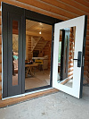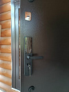 Это решение для входа в частный дом: уличная сторона в стойком порошковом напылении защищена от дождя, снега и царапин, внутри — аккуратная МДФ-панель под спокойный белый, которая легко моется и не боится повседневных прикосновений. Терморазрыв разрывает мост холода, поэтому пол и ручка остаются тёплыми даже в минусовую погоду. Визуальный центр — боковые фрамуги со стеклопакетами: они добавляют свет в прихожую и расширяют проём без ощущения тяжести. На наружном полотне — аккуратные кованые завитки и строгие фрезы, создающие объём без лишней вычурности. Биометрический замок со сканером отпечатка избавляет от связки ключей, при этом сохраняется привычная механика. Усиленные петли и плотные контуры уплотнения дают тихий ход и уверенное закрывание — дверь работает мягко, а выглядит статусно.