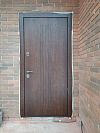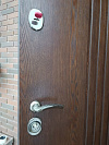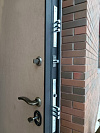 Эта дверь рассчитана на частный дом: снаружи тёмное древесное МДФ с тонкими вертикальными каннелюрами смотрится солидно на фоне кирпича и стойко переносит осадки, перепады температуры и случайные касания ключами. Внутри — ровная светло-бежевая панель: её не жалко во время ремонта, а позже легко заменить на финальную отделку. В версии входной двери Stardis Termo с временной панелью терморазрыв разнимает холодный наружный металл и тёплую комнату, поэтому ручка и откосы не «плачут», а в прихожей тише. По периметру работают мощные ригели, два разнесённых замка держат полотно уверенно, броненакладка прикрывает цилиндр. Фурнитура мягко ходит, уплотнитель сжимается без скрипа — в быту это та самая спокойная надёжность, к которой быстро привыкаешь.