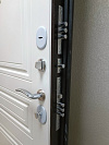 Снаружи — стойкое порошковое покрытие антик медь с мелкой «молотковой» искрой, изнутри — аккуратный белый ясень с классической фрезеровкой: контраст, который одинаково уместен в квартире и в подъезде. Металлокороб аккуратно садится в стену благодаря расширению проёма — переходы ровные, без «ступенек» под наличники. МДФ-панель внутри комфортна на ощупь, легко очищается и не боится повседневных касаний, а порошок снаружи держит мелкие удары и не выгорает. В зоне замков — раздельная связка с броненакладкой на цилиндре; при закрывании встают несколько мощных круглых ригелей, что видно на торце полотна. В описываемой конфигурации двери тайгер триумф в антик меди и белом ясене получилась спокойной по виду, но строгой по характеру: добротный взгляд глазка, плавный ход ручки и плотное прилегание по двум контурам уплотнителей.