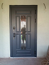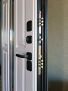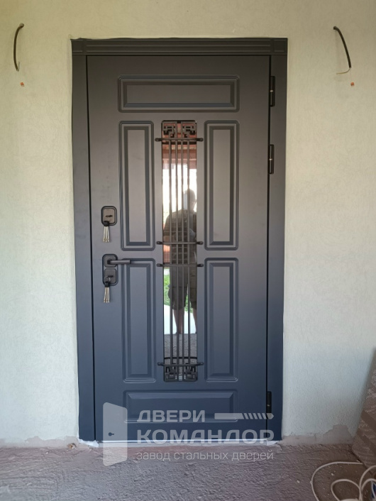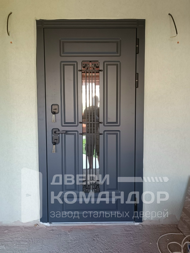 Уличная термодверь для частного дома: снаружи — графитовая МДФ-панель с глубокими филёнками и узким вертикальным стеклопакетом, прикрытым кованой решёткой в духе ар-деко. Свет проходит в прихожую, а приватность остаётся внутри. Внутри — белая МДФ с той же аккуратной геометрией: освежает интерьер и визуально расширяет коридор. Теплоизоляционный разрыв в коробке и полотне отсекует холод и конденсат, контуры уплотнения дают мягкое закрывание и меньше уличного шума. Два разнесённых замка и массивные выдвижные ригели на торце выглядят серьёзно и работают без лишних усилий, петли уверенно держат вес створки. Практичные поверхности легко моются и стойко переносят каждодневную эксплуатацию.