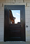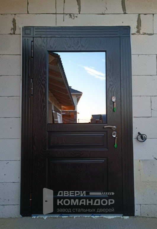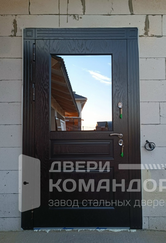 Дверь для частного дома, которая достойно встречает гостей и уверенно держит улицу. Снаружи — тёмный шпон с выразительным рисунком и филёнками, внутри — белая МДФ-панель под классику: светлая, легко моется, не темнеет со временем. Крупный стеклопакет пропускает дневной свет в прихожую, а магнитные уплотнители вместе с терморазрывом гасят сквозняки и не пускают холод. Порог из нержавейки переживёт мокрую обувь и абразив. В двери термо премиум шпон / шпон со стеклопакетом, магнитными уплотнителями, порогом из нержавейки, окраской металла в два цвета, на заказ гармонично сочетаются контрастный фасад и спокойный интерьер. Возможны наличники и доборы в цвет, предусмотрена установка видеодомофона.