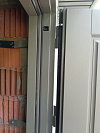 Практичная уличная дверь для частного дома: строгая геометрия, спокойный цвет и фактурная порошковая «шагрень» снаружи, которая не боится дождя, солнца и мелких царапин. Внутри — МДФ-панель с аккуратной фрезеровкой, она тёплая на ощупь, не выгорает и легко ухаживается. Входной двери терморазрыв металл / шпон на заказ разрывает мост холода по контуру полотна и коробки, поэтому в тамбуре и прихожей комфортнее в мороз и межсезонье. Два разнесённых замка и массивные выдвижные ригели, видимые при открывании, дают спокойствие каждый день, три навесные петли держат вес и обеспечивают лёгкий ход. Цвет наличников и доборов можно подобрать в тон — фасад и интерьер будут выглядеть единообразно, без компромиссов по защите и долговечности.