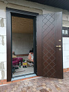 Уют начинается с порога, и эта входная дверь уверенно держит тепло дома: терморазрыв отсекaет холод, а порог из нержавейки не боится влаги и активной эксплуатации. Снаружи — МДФ с выразительной древесной текстурой и глубоким фрезерованием: строгие вертикали, рамка-меандр и круглый медальон создают благородный акцент у входа в частный дом. Внутри — та же тёплая фактура, но с другим характером: диагональная решётка с тонкими металлическими раскладками делает полотно визуально выше и легче. Из практики — износостойкая облицовка не выгорает, легко очищается от следов рук, стойко переносит перепады температуры. Усиленная коробка, несколько точек запирания и плотные контуры уплотнения дают тишину и надёжное запирание без скрипов. Получается редкое сочетание: статусный дизайн снаружи и спокойный порядок внутри.