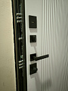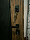 Для подъездной квартиры это спокойный, но выразительный вход: снаружи рифлёная чёрная панель и контрастная вставка под тёплый орех вытягивают полотно по высоте, визуально собирая проём. Обе стороны отделаны МДФ — материал тёплый на ощупь, не боится частых прикосновений, легко очищается, устойчив к мелким царапинам. Внутри — светлая рифлёная панель, она подсвечивает узкую прихожую и не спорит с мебелью. У входной двери YoDoors-14 Дверей Регионов из типовой серии I-515/25БИ фурнитура в матовом чёрном и аккуратные квадратные накладки; изнутри предусмотрена ночная задвижка, по контуру — уплотнение для плотного прижима. Возможна установка видеодомофона и доборов в общий тон, чтобы закрыть монтажный шов и получить чистую рамку проёма.