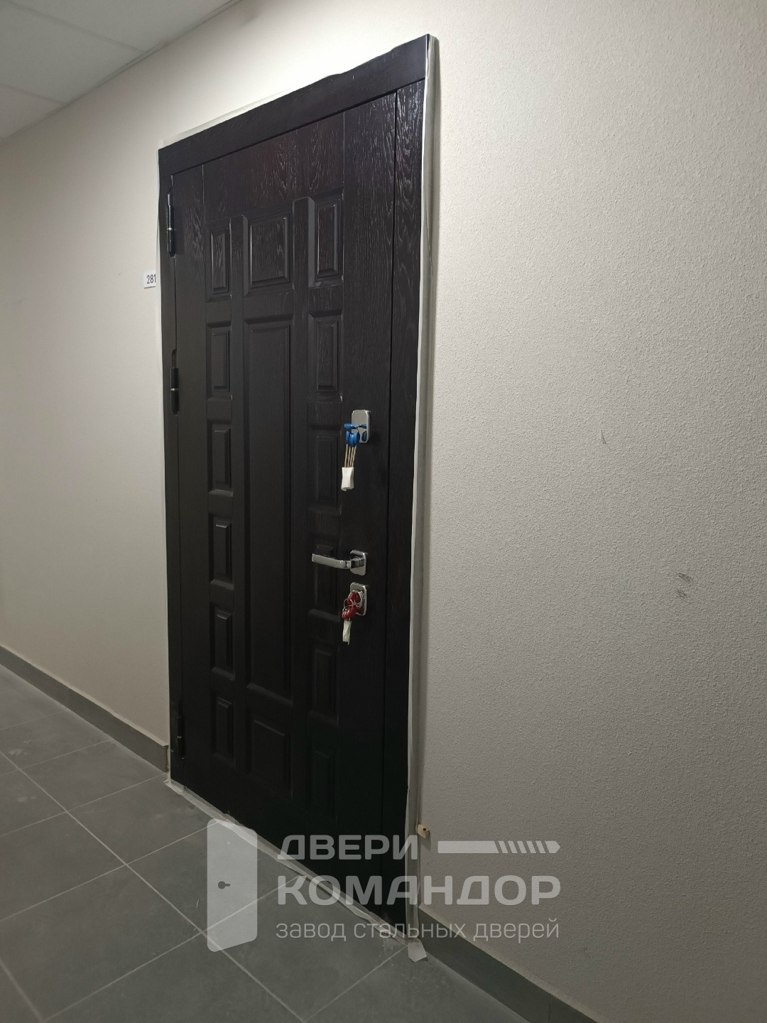 Квартирная дверь с выразительным контрастом: снаружи — тёмный «под шпон» с глубокой древесной текстурой и классической филёнкой, внутри — спокойная белая эмаль с тем же рельефом, которая визуально расширяет коридор и легко переносит регулярную уборку. Обе стороны — МДФ на металле, поэтому тепло и тише в прихожей, а покрытие стойко к бытовым царапинам и не выгорает в подъезде. Металл короба окрашен в два цвета под панели — при открывании всё выглядит цельно и аккуратно. Полотно сидит ровно, плотный притвор и контуры уплотнения гасят сквозняки; разнесённые замки управляют стальными ригелями, делая фиксацию по периметру уверенной. Хромированная фурнитура добавляет аккуратного блеска, петли работают мягко. Для тех, кто хочет надёжную дверь с тёплым внешним видом и светом внутри.