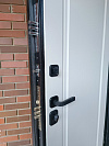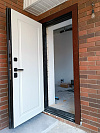 Тёплая входная дверь для частного дома под навесом: снаружи благородный шпон в тёплом ореховом оттенке с классической фрезой, внутри — спокойная белая эмаль, которая визуально расширяет прихожую и легко моется. У входной металлической двери терморазрыв шпон / эмаль на заказ разорван холодный контур: внутренняя и внешняя части разделены, что помогает противостоять промерзанию и конденсату в межсезонье. Плотный притвор и магнитный характер закрывания ощущаются с первого касания, раздельная система замков и массивные ригели фиксируют полотно уверенно. Возможны доборы и наличники в цвет, а при желании — интеграция видеодомофона без нарушения общего дизайна.