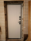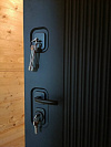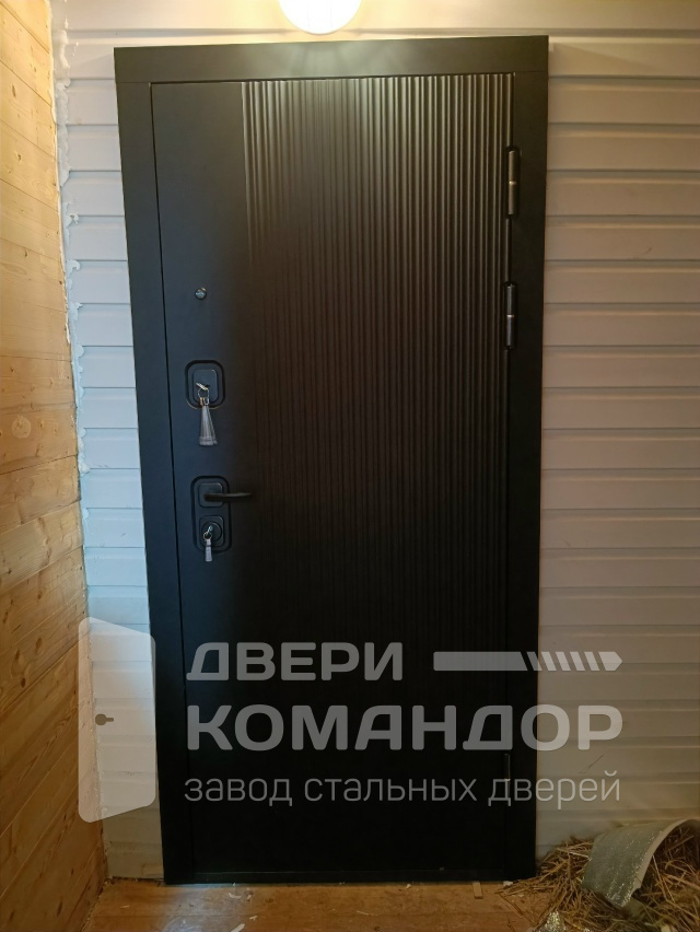 Форпост Спарта — дверь для квартиры и отапливаемого тамбура частного дома: снаружи глубокий матовый черный с вертикальным рифлением сразу собирает взгляд и добавляет строгости входу, внутри — чистый белый с той же фактурой, чтобы легко попасть в сканди или современную классику. Обе стороны — МДФ: поверхность устойчива к ежедневным касаниям, не боится случайных царапин, просто моется и долго держит рисунок. Двухзамковая система с аккуратными квадратными накладками и удобной ручкой работает мягко, изнутри есть поворотник — ушли и уверенно закрылись. Глазок помогает контролировать площадку, наружные петли усилены, на стороне притвора — противосъемные штыри, так что полотно надежно фиксируется в коробе и закрывается плотно, без дребезга. Контраст фурнитуры подчеркивает дизайн, а аккуратная кромка панели делает проем цельным и аккуратным.