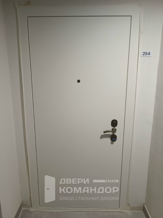 Белая входная дверь сдержанно-классического профиля: ровные канты, аккуратные филёнки и чистый матовый тон дают ощущение порядка в прихожей и не спорят с интерьером. Оптимальна для квартиры или тёплого подъезда: снаружи стойкая порошковая окраска не боится мелких царапин и уборки, внутри — МДФ-панель с тонкой фрезеровкой добавляет тепла и визуальной глубины. Надёжность здесь не на словах: двухсистемный итальянский замок с девиаторами фиксирует полотно в нескольких точках, а противосъёмные ригели на петлевой стороне подстрахуют при любом раскладе. Удобная глазок-линза помогает контролировать вход, мягкий контур уплотнения гасит звуки и сквозняки. Если ищете спокойный дизайн без вычурности и при этом требуете реальной защиты — это как раз тот случай.