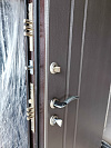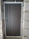 Эта дверь для частного дома и уличной установки: тёплая конструкция с терморазрывом разрывает мостик холода между улицей и помещением, так что откосы сухие, а пол возле порога не леденеет. Снаружи — тёмно-коричневая фактурная панель с объёмной рамкой из рельефных накладок: практичная поверхность скрывает следы и стойко переносит осадки. Внутри — графитовая МДФ с строгой фрезеровкой и деликатным тиснением под кожу, она визуально собирает интерьер прихожей и не боится повседневных прикосновений. В заказной входной двери терморазрыв работает в паре с несколькими контурами уплотнения: меньше шума, сквозняков и запахов. Два замка с внутренними поворотниками и аккуратная фурнитура дают предсказуемое закрывание и ощущение порядка каждый день.